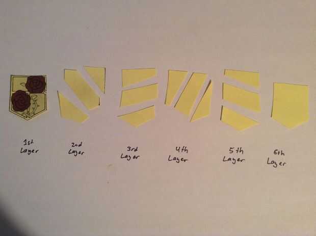 El escudo es importante contar con al menos 6 capas de cartulina de 110 libras (si uso de diluyente tarjeta stock uso 7-8 capas) cortadas las capas como el cuadro que se muestra arriba para obtener resultados óptimos.