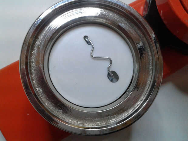 Deberá volver a poner la placa en el segundo dado, perno hacia abajo. Coloque el anillo del cromo con el frente de la divisa, en el dado, hacia arriba. Luego agregar la placa negra en el, este tiempo lado plano hacia arriba.
