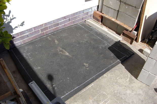 Porque el suelo era irregular, tenía que ajustar el formulario para asegurarse de que era. Este no fue un trabajo difícil y me aseguré de que la parte superior de la forma era la misma altura que los podía utilizar para nivelar la superficie de nuevo. Usé algunos 50x76mm madera (2 x 3") para los formularios secundarios y otra pieza de madera para el frente. Entonces utilicé algunos dinteles para sujetar en posición para el vertido concreto. Con el fin de mantener este hormigón separadas de la casa todavía agregué en un pedazo de goma en la parte posterior para actuar como espaciador.