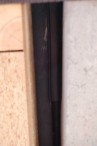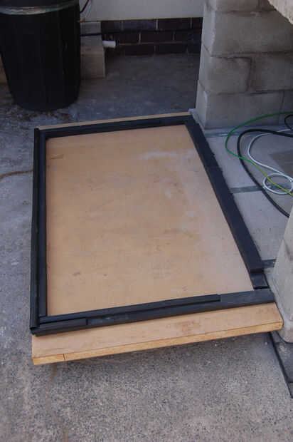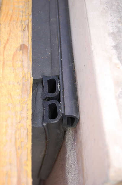 El siguiente paso fue la puerta de entrada. Quería hacerlo como "hermética" como sea posible y tan pesado como sea posible sin ser una puerta de seguridad metal u hormigón. Utilicé una antigua puerta sólida de grado comercial que tenía más de un trabajo. Es super pesado (para una puerta), pero también puede ser cortado y trabajado fácilmente en la madera. Añadí algunas bisagras de puerta a la base de hormigón y había atado a la puerta. Entonces agregué sellos de goma alrededor para que al cerrarla tendría un ajuste muy bueno. Esto era sobre todo auta-adhesivo, pero estaba pegado la goma "D-Shaped". Como se puede ver, lo sellos de goma firmemente contra los bloques y los dinteles.
