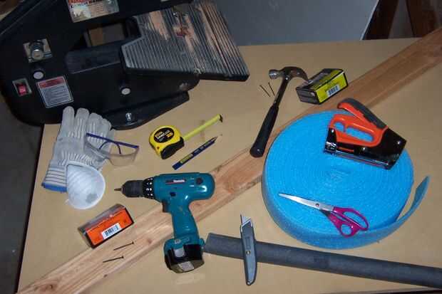 Cinta de espuma de celda cerrada. No necesita ser pegajoso. Este azul es de Lowe en la sección de aislamiento y era muy barato. En general, espuma de la cerrado-célula es identificada por pequeñas burbujas cerradas . No se ve como una esponja. Debe ser aproximadamente 1/4" de espesor. Cortar la cinta de espuma y unida entre las dos calas y a lo largo de la cara frontal de la cuña de la parte inferior.