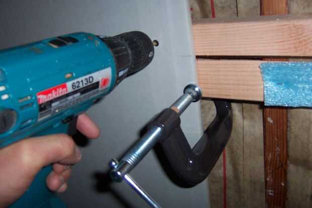 5. tornillo de la hoja de panel de yeso en cada cuña superior. Una vez más, por razones de insonorización no dejarse llevar con los tornillos. Usé tres en cada nivel. Puesto que se trata de una maniobra ciega, te resultará útil para la marca donde vas a perforar, basado en el nivel de la cuña superior a los lados del panel de yeso.