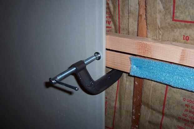 2. Sujete el panel de yeso a la Cala del fondo. Ver foto. La pinza hace todo mucho más fácil. Puesto que el panel es algo flexible, utilice los oportunidad haga los ajustes finales a la pista. Encontré una palanca de yeso muy útil en este punto.