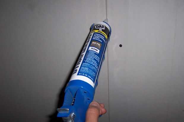 Carga tu pistola para calafatear con algunas calafateo acústico, también conocido como masilla "non-hardening" o "50 años". Aplicar liberalmente a las costuras y sobre los agujeros.