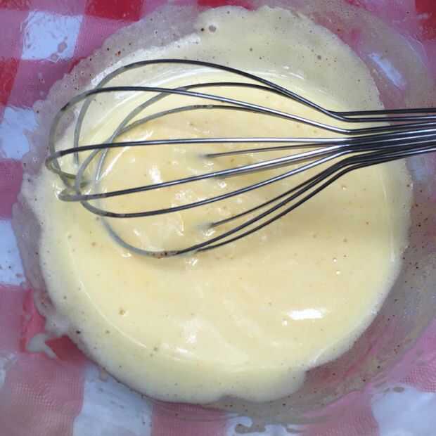 Añadir dos yemas de huevo a la taza y una 1/2 cucharada de agua y jugo de limón. Batir los huevos hasta que doble de tamaño por el calor. Se convertirán en espumosos. Añadir la mantequilla y bata hasta que la salsa es gruesa y doblada. Será lisa y caliente al tacto. Añadir pimienta de Cayena.