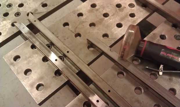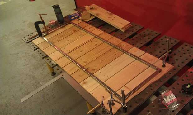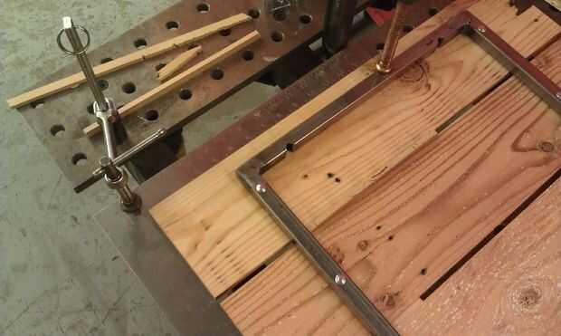 tuve desecho de un proyecto anterior, he utilizado 3/4" frío acero para un marco en. Esto fue aproximadamente 20 "x 50". Cuando marque el orificio a perforar tuvo en cuenta el ancho de la Junta, así como la brecha entre para asegurarse de que tenía el centro de todo a lo largo. MIG soldadura de las esquinas y moler liso para que todo lo pone plana (no necesita ser bastante ya que se oculta). Explotación del trabajo es importante! Incluso con múltiples precauciones, las tablas todavía comenzaron a la deriva hacia el final y necesitaba volver y tocar un poco.