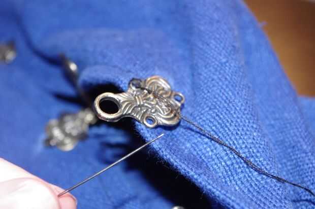 Ahora es el momento para un mecanismo de cierre, para que sus mercancías noble permanecerá privados. Elegir coser en 4 ganchos que encontré apropiado para el traje. Quería usar otro vestido debajo de este una azul y para hacer un efecto visual que dejó un par de centímetros entre la izquierda y la derecha del vestido azul. (Es una explicación muy torpe, pero será sentido más adelante).