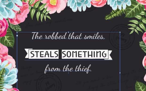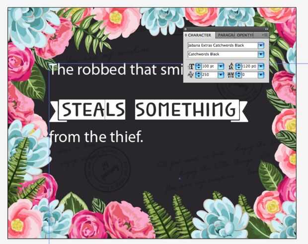 Como ya he mencionado antes, estoy usando una frase de William Shakespeare: "el robado que sonríe, roba algo de ladrón". Quiero "roba algo" en el banner. Usted notará que para ello no puede tener un espacio entre las dos palabras. Lo que puedes hacer es ajustar el kerning entre "roba" y "algo". Puede hacer esto colocando el cursor entre las palabras, manteniendo la "opción" y usando las teclas de flecha para aumentar el espaciado manual. Alternativamente puede puede abrir la ventana de personaje y ajustar desde allí. Ahora hay un vacío en la bandera, pero lo arreglaremos más adelante.
