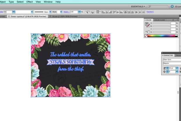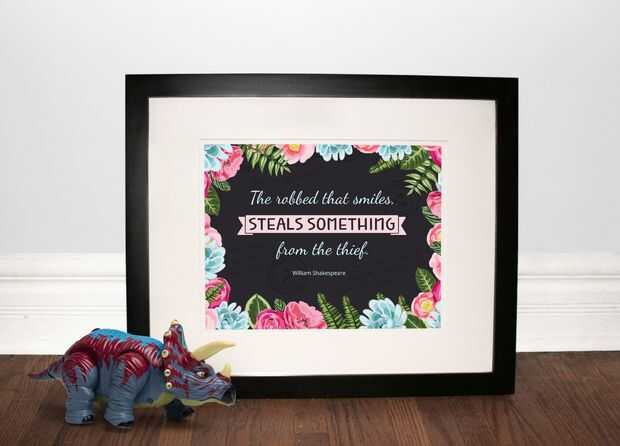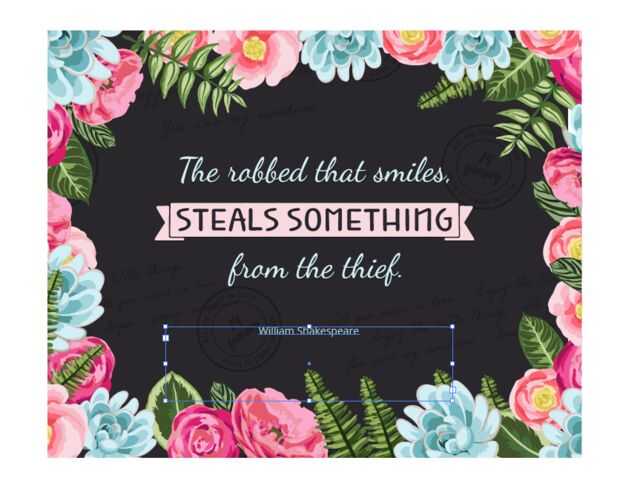 Añadir color a tu texto. Utilicé la herramienta Cuentagotas para robar el color de las flores. Luego he añadido nombre de William Shakespeare en la parte inferior en una fuente de pequeño san serif. Una vez que estés feliz con el diseño, guarde el archivo como un PDF y tenerlo impreso.
