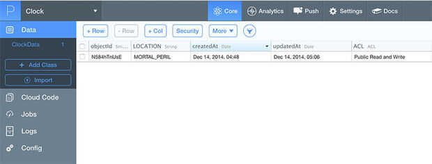 Luego, utilizamos analizar como una manera de enviar y almacenar los datos. Parse le permite escribir datos en una tabla almacenada en sus servidores Web. Usted puede ver en pantalla a continuación que almacena la ubicación. Nos escribió para que actualiza la ubicación en lugar de agregar más filas a la tabla, pero que también sería posible.