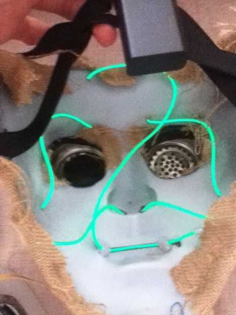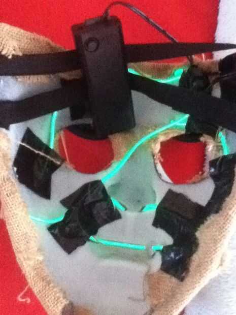 Una vez que esté satisfecho con la configuración, cinta o el alambre en su lugar con adhesivo. La batería para el cable sólo puede acortar la banda principal de la máscara, o puede ser desconectada por lo que es fuera del camino hasta más tarde.