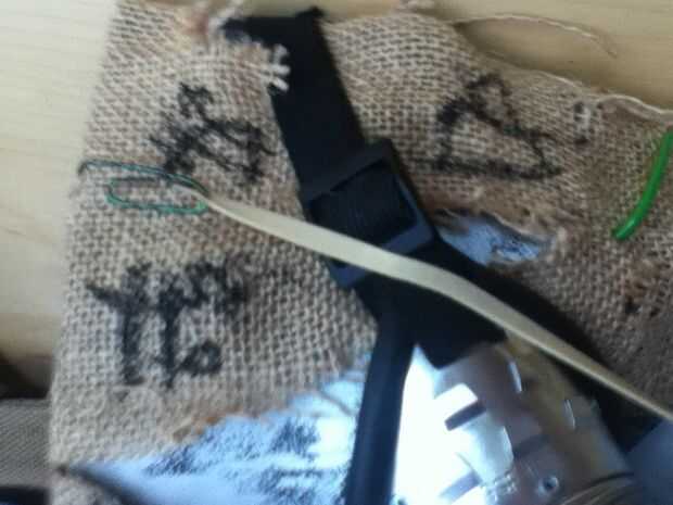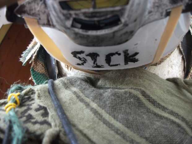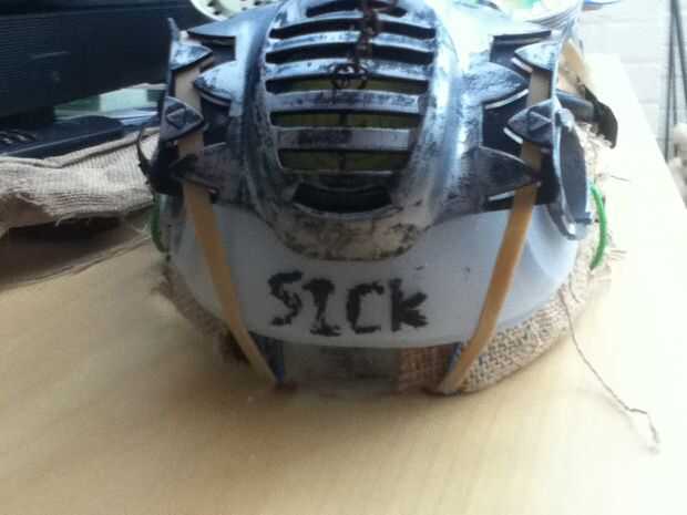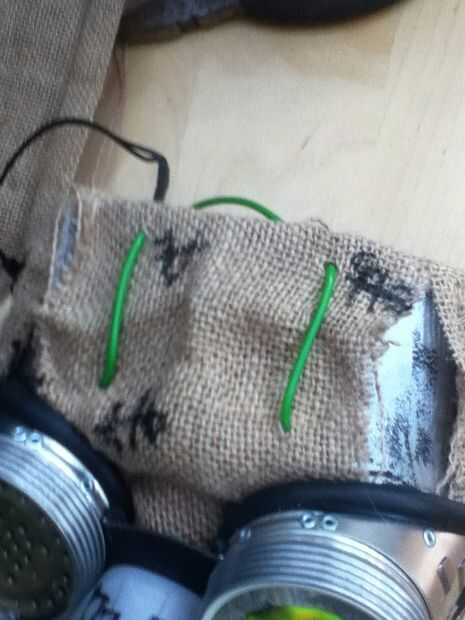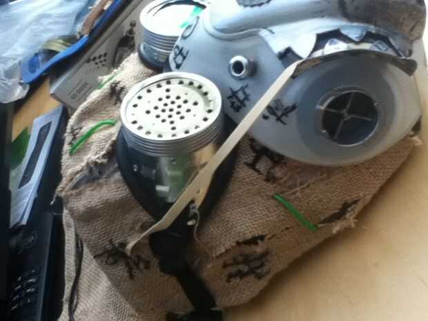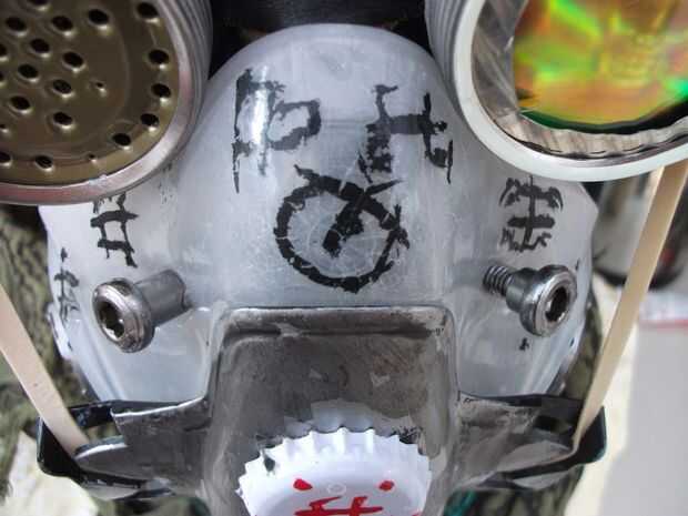Usé pintura negro caos para añadir los símbolos en el hessian y el respirador. Como el respirador fue en parte goma, tuve que añadir el aerosol de la capa transparente para preservar el trabajo de pintura que había hecho.