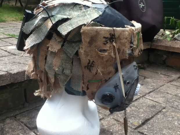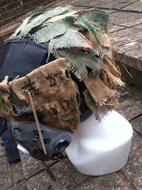Parte de la eficacia de la generación fue el trabajo del hessian de loro-como lo hice en la parte posterior. Tenía un viejo casco de pepakura ahí usé. Como se ha explicado anteriormente, hay miles de pep. tutoriales por ahí así que si quieres perseguir esta ruta, por favor google él y luego volver aquí. Puede probar y utilizar un casco de moto o algún tipo de casco en su lugar.
