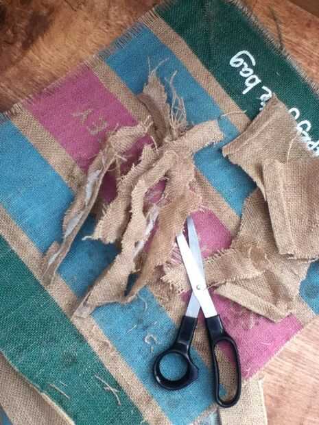 Cortar el resto de mi 'bolsa para la vida' en tiras de longitud variable. Comencé a acodar del hessian de la parte inferior del casco y mi camino hacia arriba, colocar cada pieza con pegamento,