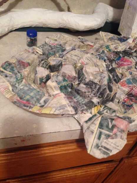 materiales:Gancho de alambreEspuma de poliestirenoCintaHarinaVinagrePegamentoSalAguaBol para mezclarPintura para barcosPro forma todo propósito junturasPapel higiénico / periódicoPintura exterior gris / oscurezca grisBola (pequeña) o globoMezcla de p