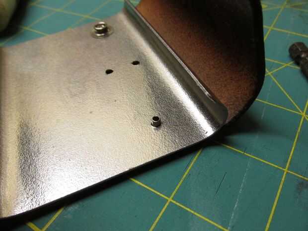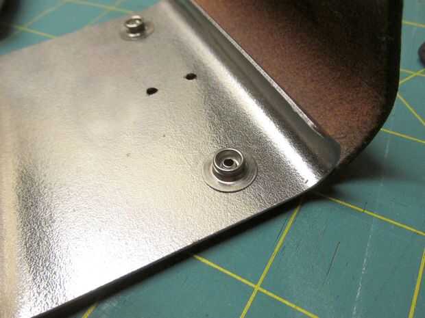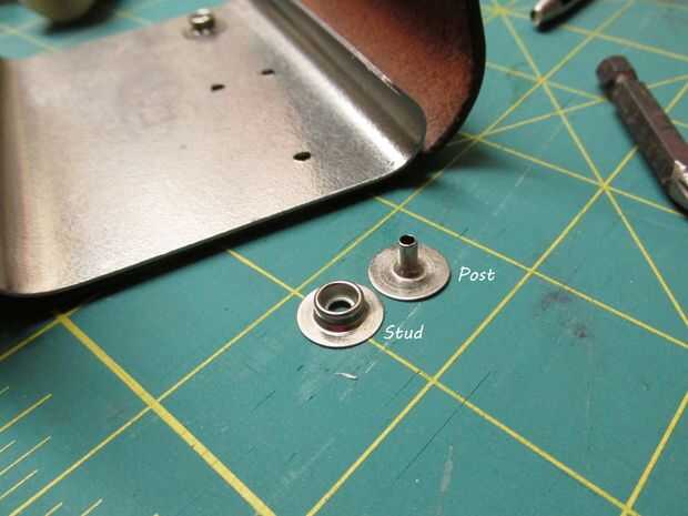Cada complemento masculino se compone de dos partes, la viga y el poste. El espárrago es el "cierre" y el post es la parte que pasa a través de la piel y fija el perno en su lugar. Para montar los broches macho, empuje el poste a través de los agujeros de perforado/taladrado previamente en el caso de cuero y metal apoyas para que al final del post está en el mismo lado que el soporte de metal. Coloque el perno en el poste y utilizar la herramienta sistema snap para el puesto de bloqueo en el perno de la seta.