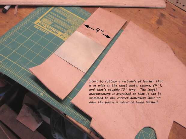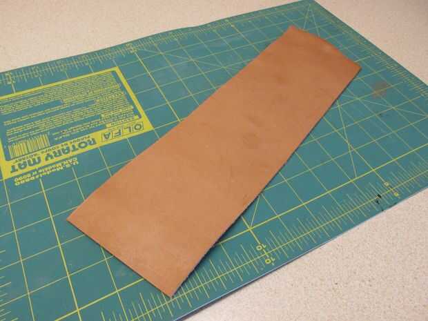 Medir y cortar un rectángulo de cuero que es 10" de largo por 4" de ancho, (el mismo ancho que el cuadrado de metal de hoja. La longitud de 10" es sólo una conjetura en este punto que saldrá un montón de material para marcar la longitud final después. Como cortes, recuerde que el truco de cuero corte en varias pasadas. Si intentas hackear a través de la piel en una sola pasada vas a botch su corte o lesiones, así que Tómese su tiempo y hacer cortes ligeros sucesivos hasta la rebanada del todo el camino a través.