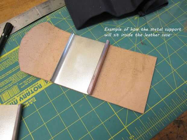 Para el caso de la piel mantenga su forma creé un armazón metálico de soporte que se ajuste en su interior. El apoyo se hace de un 4 "X 4" 16 calibre metálico cuadrado que ha sido suavemente curvado en dos lados para permitir que el caso de cuero envolver alrededor de él.