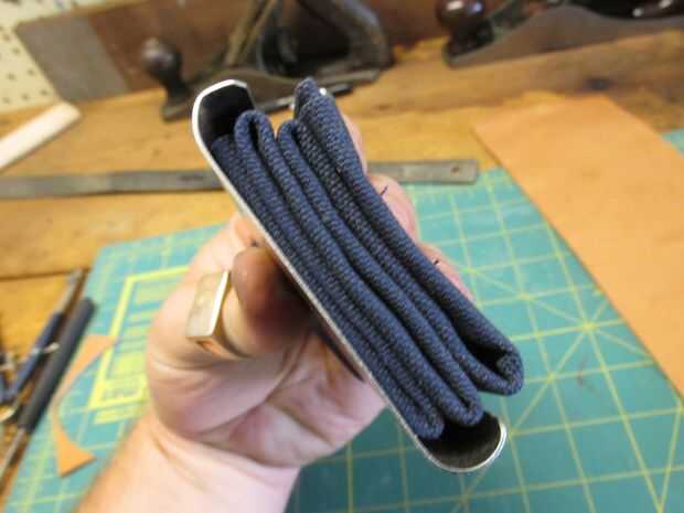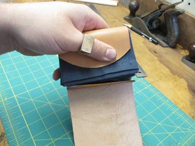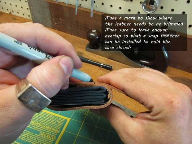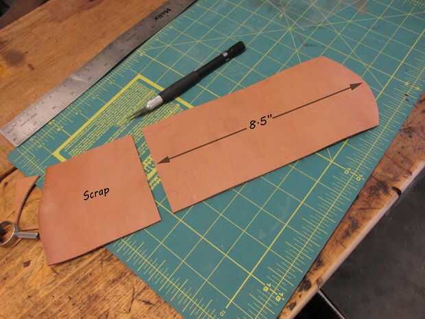 Ahora tienes todos los componentes básicos de la bolsa de cinturón, la funda de piel, el soporte metálico y la bolsa de lona. Doble la bolsa y hacer un montaje de prueba de las piezas para ver cómo se encajan entre sí. Ahora usted puede marcar y recortar el cuero a su longitud final, que debe ser a la derecha alrededor de 8.5" de extremo a extremo. Cuando se recorte Asegúrese de dejar al menos 1" traslapo en los extremos al cortar el cuero a su tamaño final. La superposición se utilizará para montar el fijador de complemento que se usa para mantener la funda cerrada.