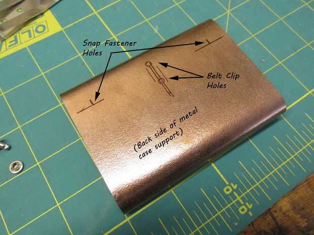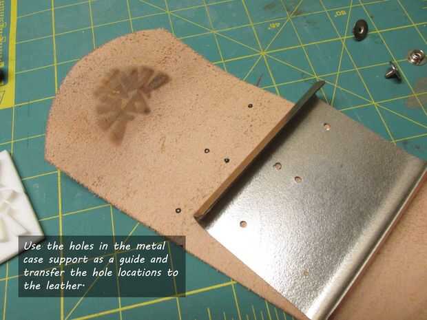 El siguiente paso es diseño y taladro/punzón los orificios que servirán para montar el clip de bolsillo y broches usados para atar el bolso de la lona a la funda de cuero. Empezar por trazar las posiciones de los orificios en la parte posterior del soporte caja chapa como diagramado por encima. Use un taladro de mano o taladro para taladrar las posiciones de los orificios en el soporte metálico y luego utilizarlo como plantilla para transferir la ubicación de los orificios en el cuero.