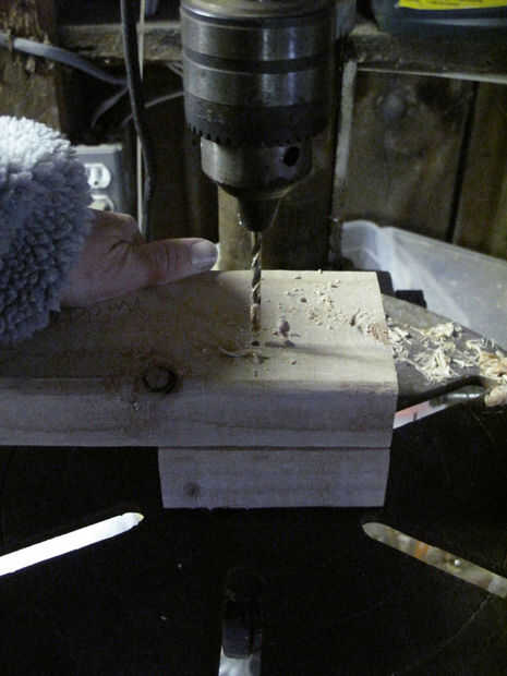 - Taladro 4 agujeros (2 en cada lado) a través de la parte superior de la 26'' pedazo en las patas abajo... asegurando para no golpear los tornillos pones, en los últimos pasos.