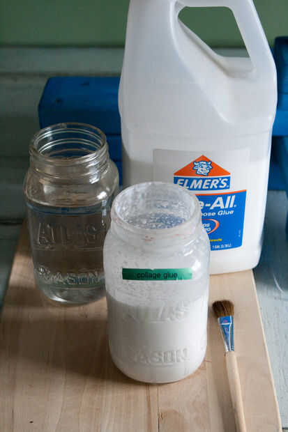 - Cortar su cola blanca añadiendo agua a ello... por lo que es pegamento de 50%, 50% de agua.