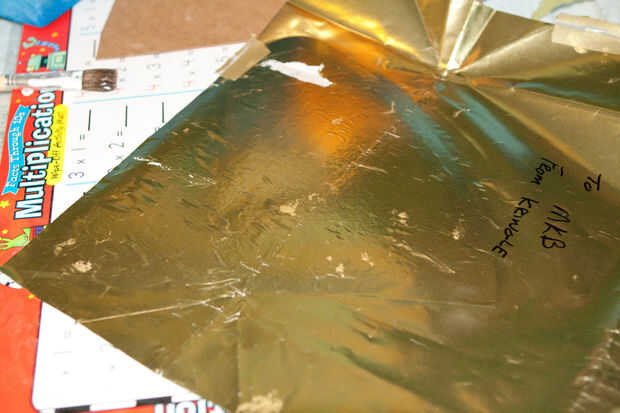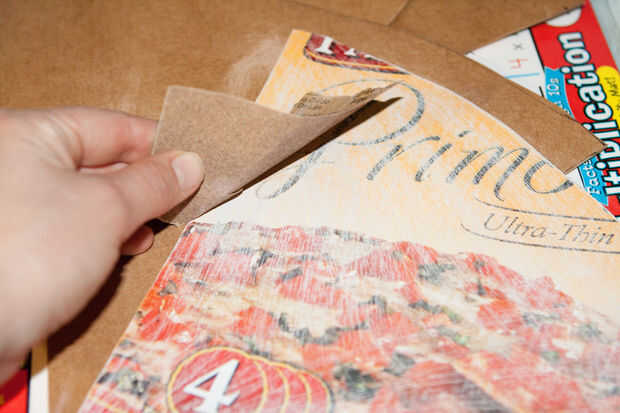 - bruto por el lado brillante de la caja de cereal, con un papel de lija (ok, en este caso es una caja de pizza)