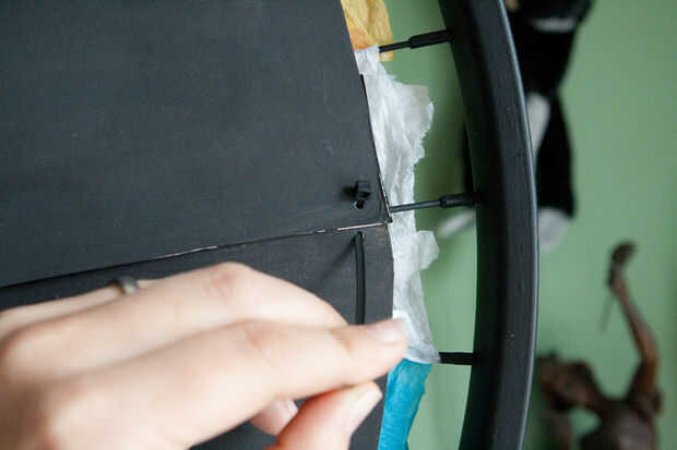 - Me pareció más fácil hacerlo en los lugares donde las piezas superpuestas, o acoplados uno contra el otro primero. cuerda la amarra por 1 pieza, detrás de los radios y hasta a través de la otra pieza.