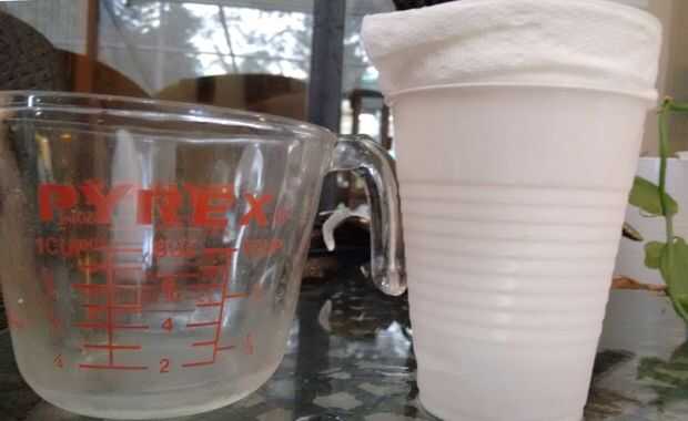 Al final de la hora, las dos tazas anidadas con la toalla de papel entre ellos tenían apenas cualquier condensación en el exterior y sólo se trata de una onza de agua derretida del hielo.