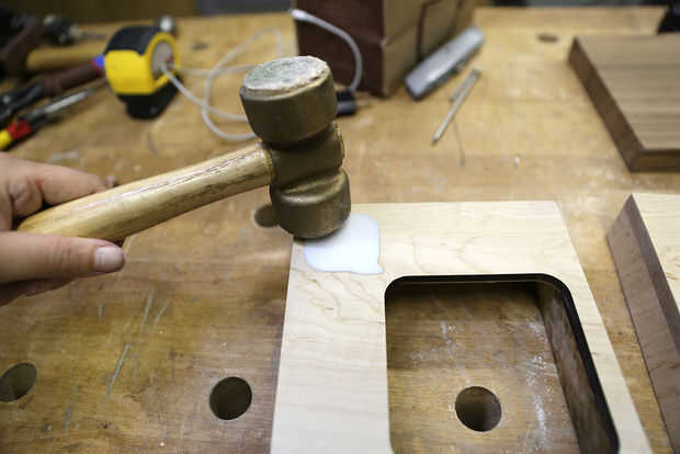 Cuando esté satisfecho con la colocación, tomar el mazo y toque la pieza, empezando con el borde más alto y continuando en los restantes. Si un borde termina de hundirse un poco más, puedes probar aplicando fuerza detrás de la incrustación a incluso hacia fuera o puede pop hacia fuera y vuelva a intentarlo. En mi experiencia, es generalmente tan pequeña cantidad, que es mejor dejar sola.