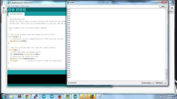 Para tener una idea de lo sensible que es, abrir el IDE de Arduino y navegar el dibujo de ejemplo AnalogReadSerial. Gancho de Edison a la computadora vía USB (desconectar la batería si está conectado). Si no está familiarizado con Arduino, revisa la página en su sitio web .