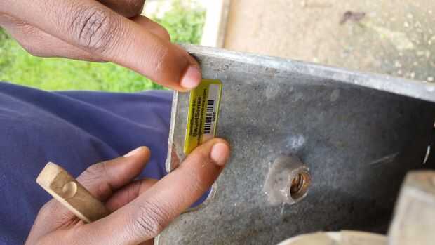 Limpieza donde poner la etiqueta de la bomba con un cepillo de alambre, a continuación, poner la etiqueta de la bomba (bomba ID) y tomar una foto de él.