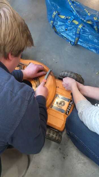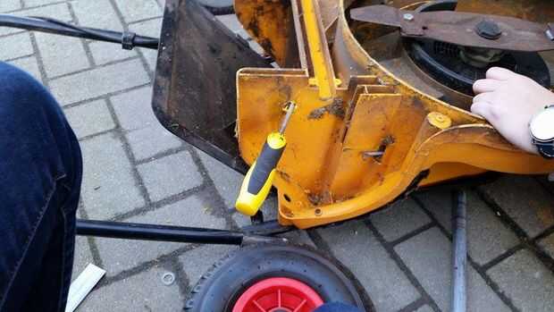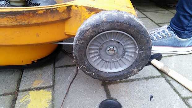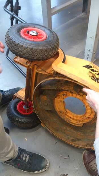 Primero eliminas las dos ruedas de la cortadora de pasto.