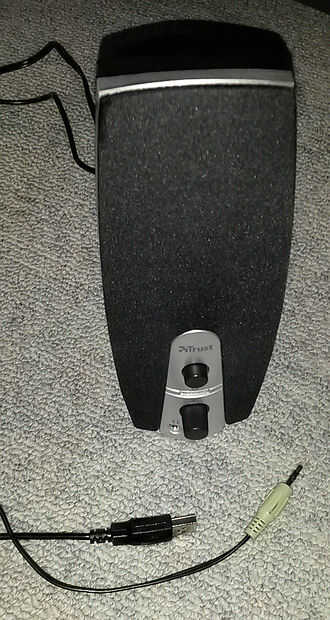 Usé uno con USB potencia y 3,5 mm jack de audio. Hay un par de este tipo de altavoces alrededor. Elegido un altavoz activo porque ha dedicado energía control y recambio de volumen si necesita ser un poco más fuerte entonces normal. Un pequeño Altavoz pasivo había hecho el trabajo, pero son difíciles de encontrar aquí y sobre el mismo precio como activo XD