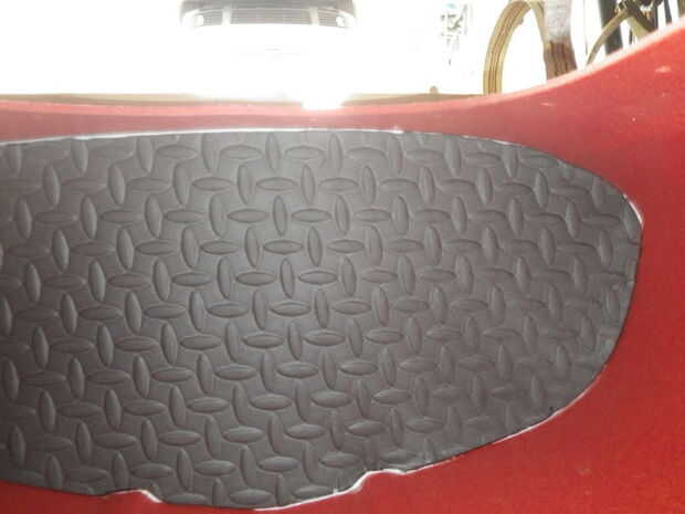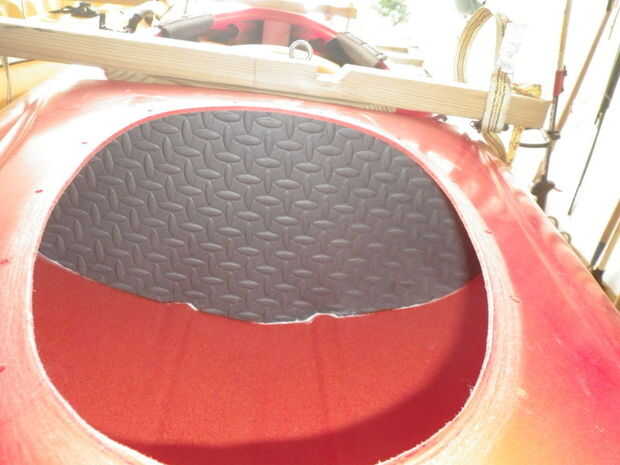 Finalmente aplique una tira alrededor de la costura exterior de la espuma en ambos lados. Esto se logró más fácilmente por el pie el kayak en un extremo y luego el otro para obtener ayuda de la gravedad. Acceso detrás del labio de la bañera puede ser ajustado y usted podría tener a dedo en un poco a la vez!