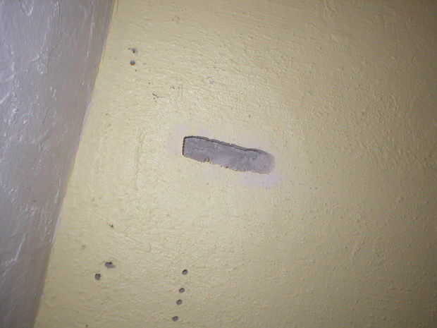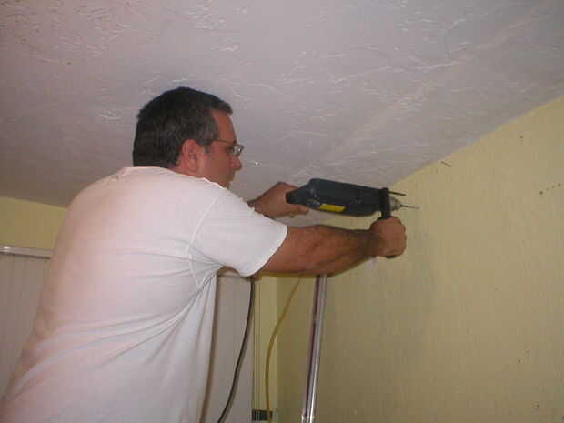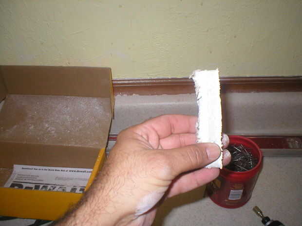 En este punto soy un poco desesperada puse unos agujeros inferior en la pared y encontrar buen bloque sólido detrás de la mampostería seca, hmmm... Frustrado ponga el taladro y salir y sentarse rascándome la cabeza. Puse en una llamada telefónica a mi padre quien era un maestro de taller de 30 años y empezar a hablar con él sobre mis opciones. Bien que estaba un poco confundido ya que ha vivido en madera enmarcado casas para siempre en el norte de Florida, yo que nunca viviría en otra madera enmarcado casa después de tener mi casa quemar conmigo en una vez pero es una historia para otro momento. Mientras hablaba le sugiero que sólo podía usar la nueva herramienta rotativa Dewalt que me dio recientemente para cortar una tira de yeso para encontrar lo que está allí, él piensa que es una buena idea así que tome el teléfono y empezar a cortar. Así que... con una tira de corte de la pared, tomar un pincho de metal y comienza a sondear allí, efectivamente termina la pared unos 3" desde el techo pero siento algo de 2" nuevamente se siente como la madera, hmmm... debe ser un tapón en las vigas del techo sujetar a la pared. Una pequeña nota sobre el diseño de mi casa, tengo una casa de bloque con un techo ligeramente inclinado y no haces solo cajonera espacio y un techo. Así que desde este muro está en el interior de una pendiente hacia arriba que el bloque nunca alcanzará el techo aquí, tiene sentido ahora.