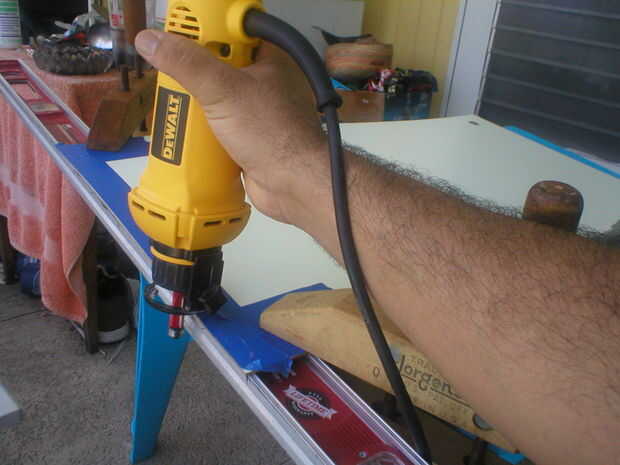 Una cosa para notar que aquí es que uno de los paneles posteriores era demasiado larga para el cuadro y bombeado hacia fuera, es sólo aproximadamente 1/16" de mucho tiempo pero no había manera para conseguir plano sin cortarlo. Pensé sobre esto un poco que significa que tenía una cerveza y miraba un poco TV. Así que después de pensar decido fijar el panel a un borde recto y utilice una broca de corte al ras en la herramienta rotatoria. Pongo masking tap sobre el lado blanco bonito del panel para evitar saltar y mantenga que la pinza sucia se enfrenta a la superficie. Sinceramente parece que he usado una de estas pinzas para cambiar mis pastillas antes de... Pero yo nunca haría eso...
