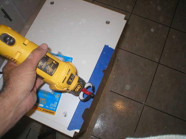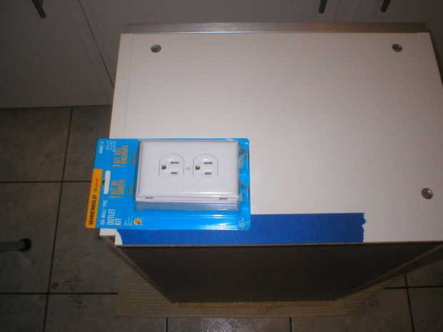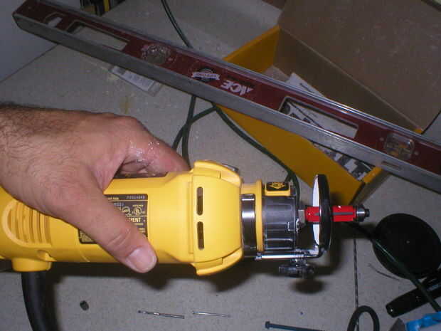 Así que tengo un alambre vivo detrás de los armarios, por lo que voy instalar enchufes debajo de los gabinetes en cada extremo. Tan hacia fuera viene herramienta giratoria de Sr. con un poco de corte al ras para cavar un canal para ejecutar el cable hacia fuera en la parte inferior del gabinete. Si no han tratado con estos armarios antes de que te digo, la parte superior una parte inferior de los gabinetes son aproximadamente 1/2" de más allá de la parte posteriora y los lados así que hay espacio detrás de los gabinetes cables, diseño muy bonito. Mientras estoy agujeros de corte decido cortar un pequeño agujero en la mitad posterior de cada gabinete que Encamine los cables para las futuras luces debajo de los gabinetes.