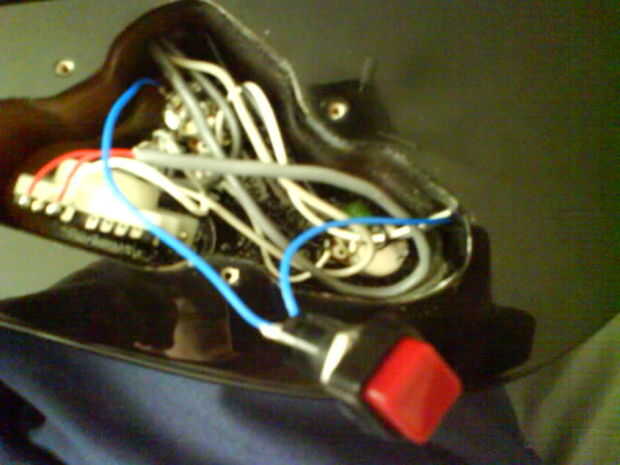 En definitiva este, un cable va desde el interruptor a la base de la olla de volumen, y el otro va a una de las dos clavijas en el conector de salida (mina fue la punta más alta, si conecta un cable a uno de los dientes, conecta tu guitarra a tu amplificador, y el interruptor no funciona, entonces el alambre a la otra punta de la soldadura.