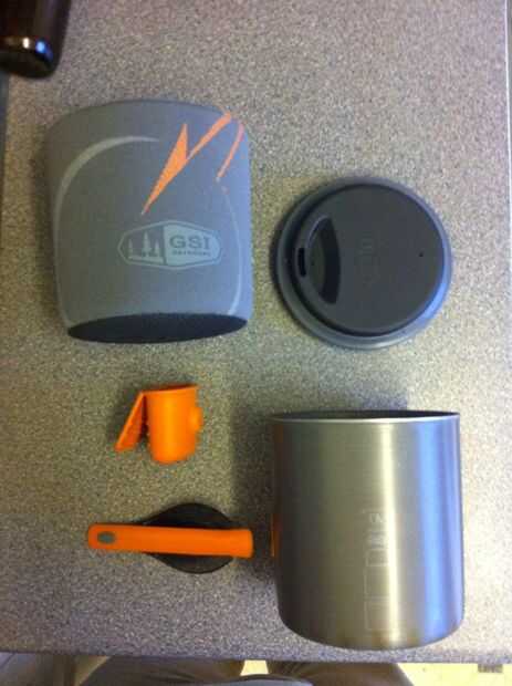 Este es el sistema de cocinar GSI al aire libre , llevará a cabo 600 ml de agua fácilmente, viene con todo lo que se puede ver en la primera foto, es una configuración de gran peso ligero que se sienta en la estufa bien y no se utiliza demasiado espacio en mi paquete.