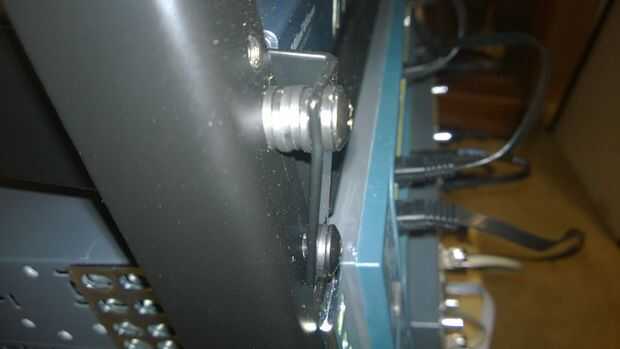 - A continuación se pueden montar los interruptores. Mis interruptores no tienen el rack soportes (orejas) conectado. El kit de vino con algunos soportes de metal genéricos y los tornillos que eran bastante fáciles de montar los interruptores y luego los interruptores. Con los interruptores se montar "frente frente" para ver los puertos de Ethernet a la parte delantera de la parrilla. Con los interruptores, no debe ver los puertos de cable de consola o poder (que se enfrentarán a la parte posterior de la cremallera).
