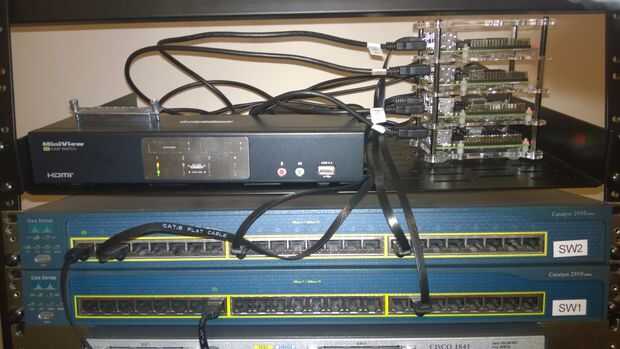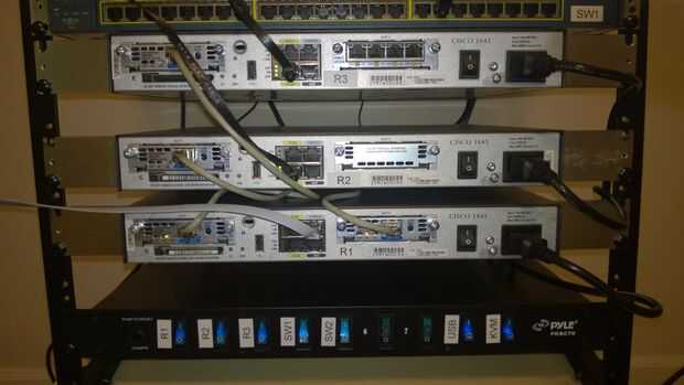 - A continuación pongo los routers. Asegúrese de dejar espacios entre los equipos para administración de cables donde sea necesario. Los routers realmente pasará "hacia atrás" para que la mayoría de los puertos se enfrentan a la parte delantera de la parrilla. Con los routers debería ver el puerto para el cable de alimentación.