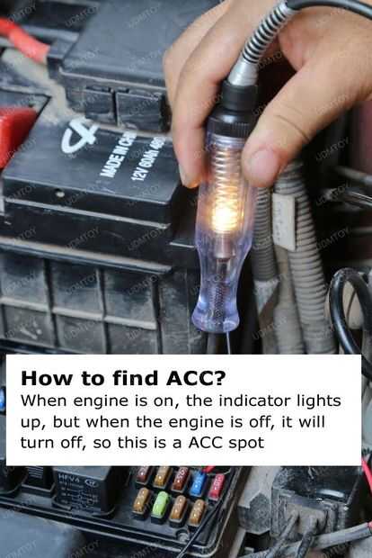 Encuentra la CAC en su caja de fusibles y toque el cable rojo allí. Puede encontrar la ubicación de ACC con un medidor electrónico de sujeción del cable negro al negativo de la batería o el suelo. Introducir el bolígrafo de probador en la caja de fusible abierto en cualquier ranura ocupada y recordar los lugares donde la pluma del tester no se encienda. Arranque el motor y prueba sobre los puntos que no encienden. Encontrar el lugar que se ilumina sólo cuando el motor está encendido. Este es el punto de ACC.