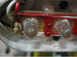 Esta es la luz intermitente con el tablero del LED y el pegamento caliente mantiene en su lugar. Hay dos cables negros que van de esta placa construí a los 555 temporizadores el lado negativo va a la vía negativa en la Junta 555 y el cable positivo va al pin de salida del 555 temporizador después de la resistencia! la resistencia está entre el pin de salida del 555 y el cable que va a las luces.