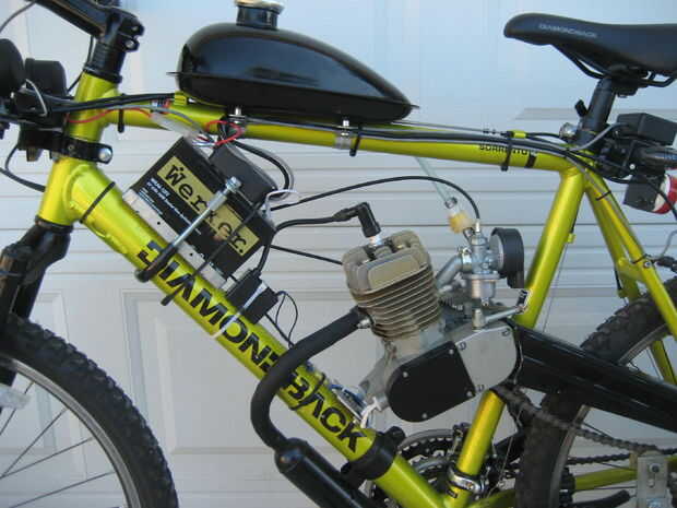 "Eléctrico" está entre paréntesis porque la necesidad de CFL (lámpara fluorescente compacta) un voltaje de DC lo suficientemente alto como para iniciar y llevar una batería tan grande alrededor de la moto no es práctico a menos que ya necesite p