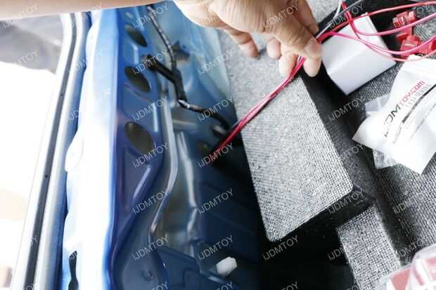 Retire el forro de alfombra de baúl y elaborar los cables a través del tronco y a través del orificio del firewall.