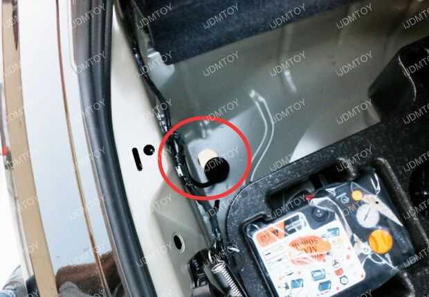 Ahora quite el forro del baúl. Se expondrá el orificio del firewall con un sello donde que se van distribuyendo los cables a través.