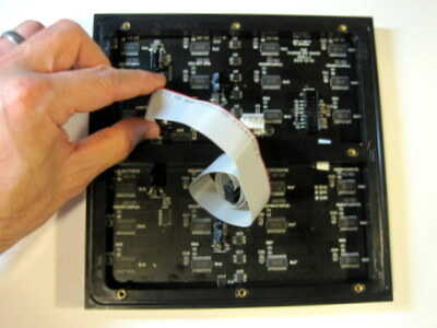 ![]() | Voltee la matriz LED y conectar el cable. Nota los dos encima de las flechas grabadas en el lado de la matriz de LED. Asegúrese de que las dos flechas apunten hacia arriba. Conecte el cable al conector de la izquierda. El conector del cable es dentado y pasará sólo una vez. No se utilizará el conector a la derecha. |
