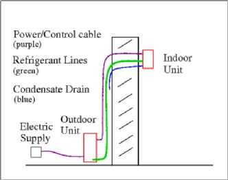 El siguiente paso es determinar lugares adecuados para los componentes (unidades interior y exterior). Para el Aura, la unidad interior pesa unos 10kg y está diseñada para ser montado en alto en una pared exterior. La unidad exterior pesa unos 40kg y puede ser montada sobre una losa de hormigón, sobre un soporte colgado de una pared o en un soporte de metal. Consulte el manual de instalación para espacios libres recomendados. La unidad exterior no debe estar expuesta a clima severo y no debe estar ubicada donde puede aspirar en escombros, suciedad, hojas etc. En la operación, soplará aire caliente (al calor), o aire frío (al calentar), por lo tanto deben probablemente no emplazarse junto a un patio etc. donde las personas se sientan.