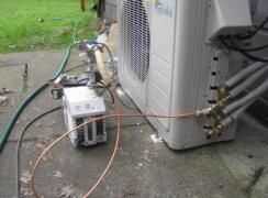 Las líneas de refrigerante y bobinas unidad interior será bombeadas y permitió a los outgas cualquier humedad. El Aura está equipado con una accesorio con una válvula Schrader para aceptar, creo, un calibrador de tubo de 5/16" acoplamiento con el abrelatas de Schrader como"Yellowjacket"marca de purga. Las líneas de la bomba hacia abajo durante al menos 20 minutos, idealmente más de largo y asegúrese de que la presión no aumenta significativamente cuando se cierra la válvula de la bomba al final de este período. Abra las válvulas empaquetadas para permitir refrigerante en las líneas, desconecte el acoplador (cierre de la válvula de Schrader) y prueba de fugas todas las uniones las de las unidades interiores incluyendo. Cerca de las unidades interiores, la fuente de alimentación, encienda el sistema y probarlo.